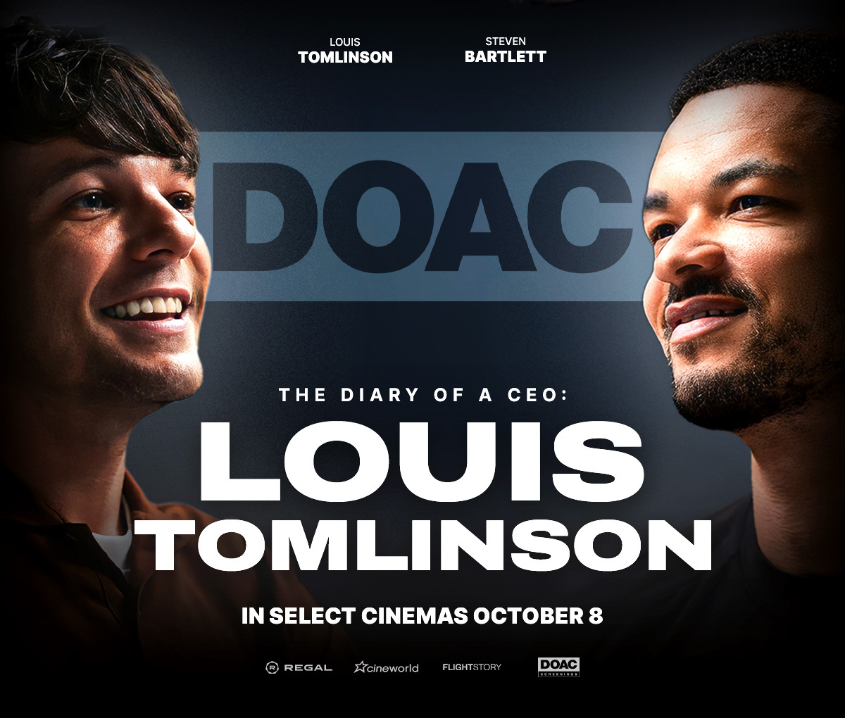 Cineworld are proud to announce the first release of a podcast in cinemas across the UK (and the US in their Regal cinemas) with the world exclusive premier of The Diary Of A CEO with Louis Tomlinson. This first-of-its-kind podcast screening will feature the singer-songwriter’s candid conversation with host Steven Bartlett.